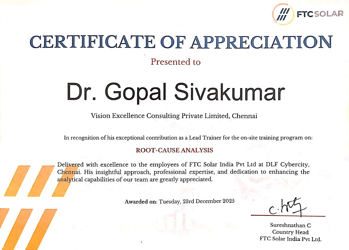 Discover how Dr. Gopal Sivakumar’s Six Sigma training has transformed careers and businesses. Hear directly from professionals who have mastered Lean Six Sigma with Vision Excellence.